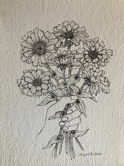 Now I am enjoying participating in various art group and classes, renewing my interest in drawing, painting and collage. My art celebrates nature and the beauty that surrounds us in everyday life. I have been working on creating an ABC book of flowers in ink and watercolour which I have been thinking of getting published.
